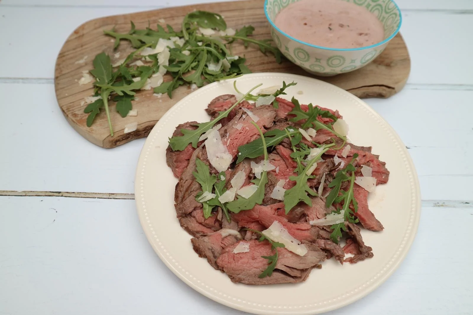 Beef fillet sliced thin and served with rocket and parmesan.