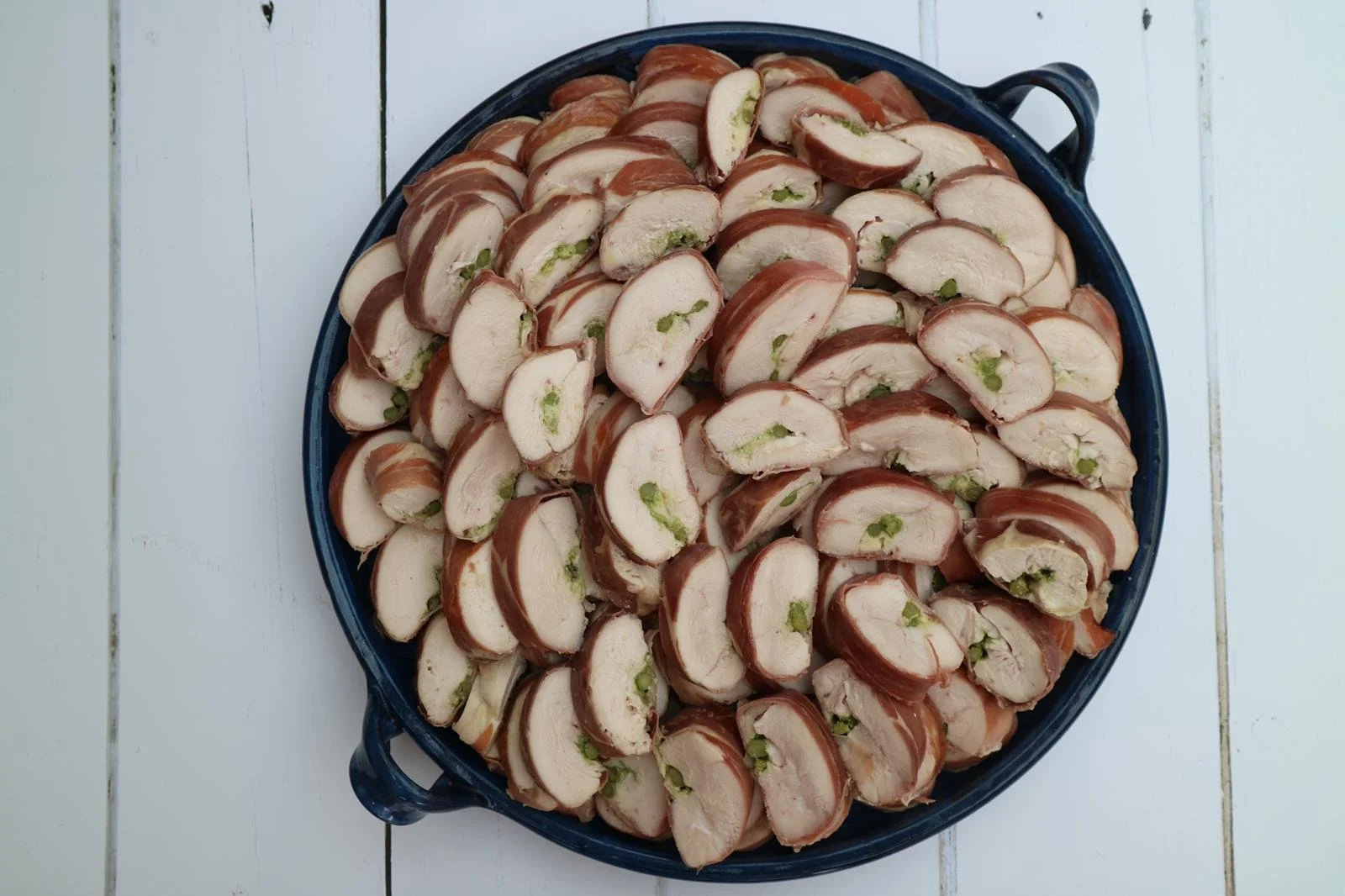Chicken breasts stuffed with asparagus, mozzarella and pesto, wrapped in parma ham.