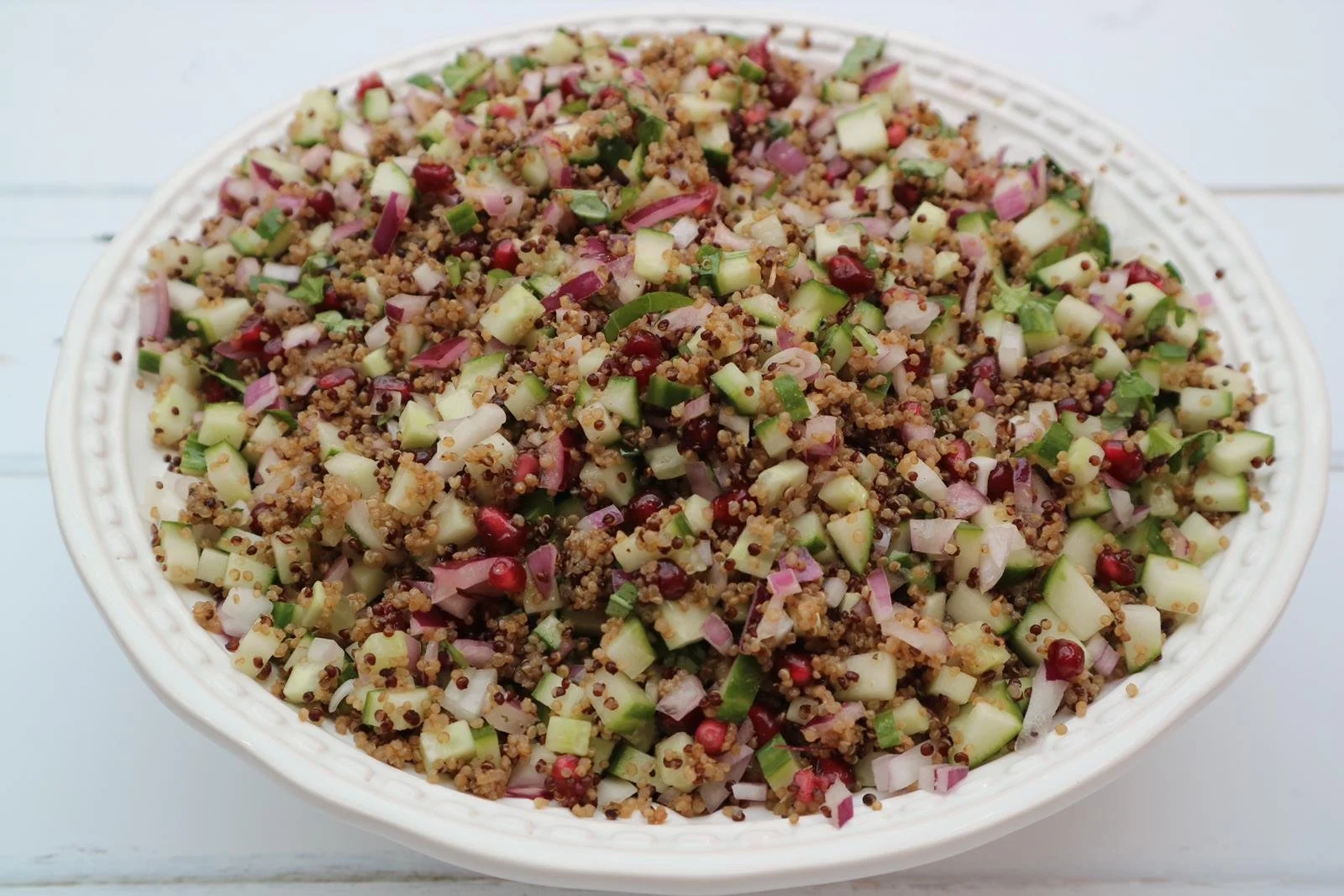 Quinoa salad with pomegranate, red onion, cucumber and basil with an apple cider vinegar dressing.